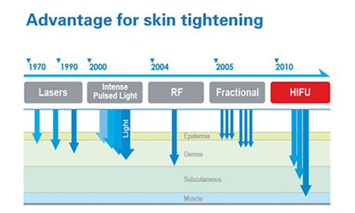 First there were lasers, then intense pulsed light (IPL), then came radio frequency (RF), then fractional laser and RF, and finally HIFU. Although laser, Intense pulsed light, radio frequency and fractional laser have their benefits, HIFU is the only non-surgical treatment that can reach the subcutaneous and SMAS layer (see diagrams). It is completely non-invasive.
