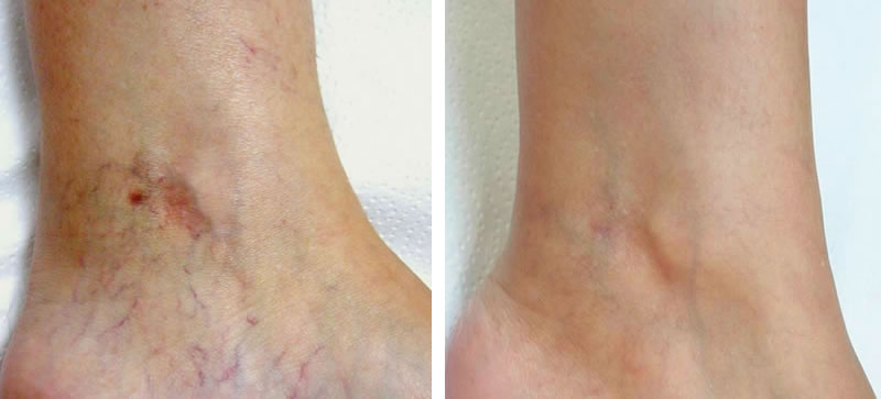 Immediately after the procedure, you will notice a slight bump on the skin. This usually disappears within a few hours after the treatment. The skin above the treated veins will have a reddish 'cat scratch' appearance. This usually disappears within a day or two. There may also occasionally be some bruising. The pain is usually minimal after treatments. Over the counter analgesics (pain killers) may be taken if required. There is no down time and normal activities can be undertaken afterwards. You may go straight to work after treatments.